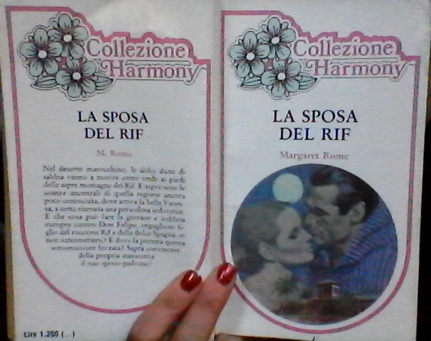 Commento di Lunaria: un romanzo che inizia anche in modo accattivante, alla "Delly", nel guadagnarsi l'attenzione della lettrice (con il dramma della morte del nonno della protagonista e lei che si ritrova a vagare tutta sola e disperata, stile "Mitzi" https://recensioniromanzirosa.blogspot.com/2022/01/mitzi-dei-delly-romanzi-della-rosa.html ) ma che poi, durante lo svolgimento, va incontro ad una serie di criticità, dal momento che Vanessa viene letteralmente rapita e sposata contro la sua volontà dal personaggio maschile della vicenda, Don Felipe. Certo, alla fine "c'è l'amore, i due si amano", ma oggigiorno vicende del genere che erotizzano lo stalking e il maschilismo non sono più "scusabili"(https://recensioniromanzirosa.blogspot.com/2020/11/non-e-amore.html) perciò "La Sposa del Rif" va letto per quello che è: un romanzo, ormai anacronistico, che riporta schemi ormai improponibili (oltre che reati) di relazione uomo-donna. Non è scritto male, anche se i paesaggi del deserto non sono resi al meglio (autrici come Hull, Hilliard o Sellers hanno scritto dei Desert Romance decisamente migliori) (https://recensioniromanzirosa.blogspot.com/2021/03/lo-sceicco-di-edith-m-hull-romanzi.html) (https://recensioniromanzirosa.blogspot.com/2023/08/la-citta-dei-tamarindi-di-nerina.html) (https://recensioniromanzirosa.blogspot.com/2021/06/il-sigillo-di-shakur-di-alexandra.html) ma, a meno di non soffrire della Sindrome di Stoccolma, è assolutamente impossibile "ritrovarsi invaghite" di Don Felipe, tipo di uomo che esiste ancora in zone arretrate del mondo ma che qui in Occidente non si può proprio "vedere". Difatti, per tutta la lettura, l'ho trovato assolutamente borioso ed insopportabile.